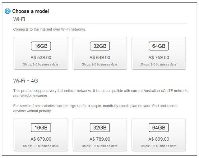 일단 시장조사를 시작했다. 하긴 시장조사까지 운운할 필요도 없는 것이 호주에 출시되는 날 바로 구입을 했으니 애플 매장말고는 비교할 곳이 없었다. 그래서 애플 홈페이지에 접속해서 Spec과 가격을 보았다. 별다른 이야기는 없고 사진과 같은 가격이 나온다.