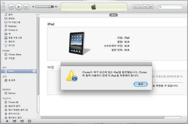 컴퓨터로 돌아가서 아이튠즈를 실행한다. iPad 2는 (물론, 모든 apple 계열의 스마트기기들은) 아이튠이 없으면 바보다) 그리고, 이제 벽돌(?)이 되어버린, iPad 2를 케이블을 이용해 연결을 한다.