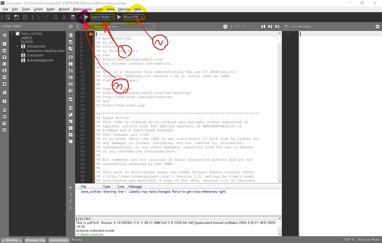 먼저, 1번에서 처럼 "Quick Build"라는 것으로 세팅을 한다. 글자옆의 작은 역 삼각형을 누르면 드롭다운 메뉴가 나오고 거기서 선택을 하자. 그리고나서 2번처럼 "View PDF"를 선택하자. 나머지는 차차 손대보기로 하고 일단은 이렇게 세팅하는 것을 논문 작성시 (나는 제일) 많이 사용한다. (중요 포인트: 당연한 이야기겠지만 컴퓨터에 PDF 리더는 설치되어 있어야 한다.) 그리고 나면, 3번이라고 쓰여진 제일 앞쪽의 삼각형을 눌러준다.