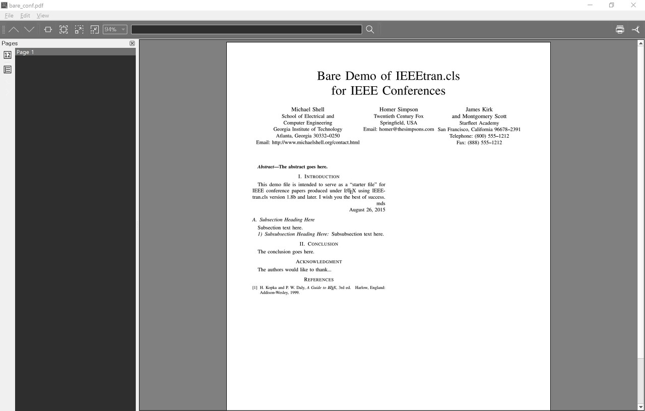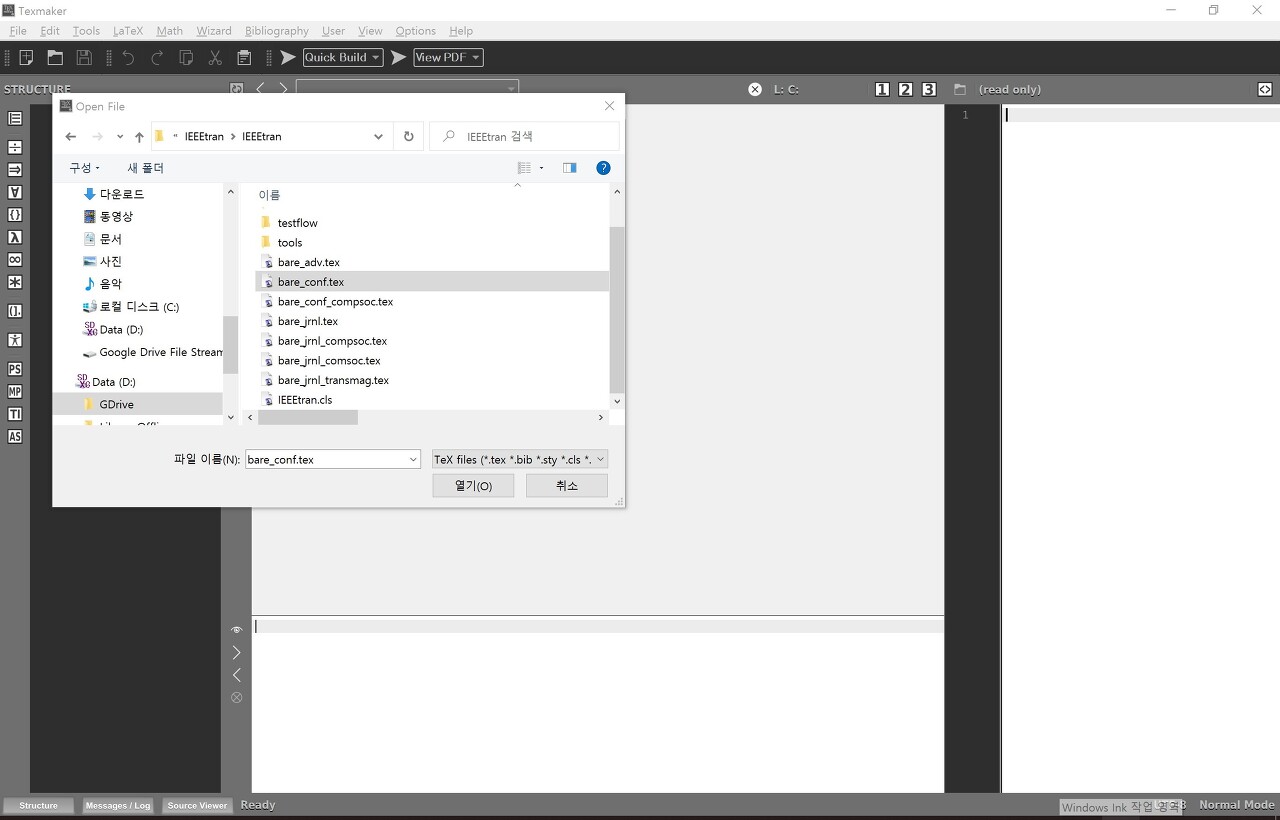 이제 아까 열어둔 Latex 화면으로 가자. File/Open/.../IEEEtran/bare_conf.tex를 선택해서 파일을 오픈해보자. bare_conf는 이름에서 나타나듯이 conference용 Latex 포맷이 되겠다.